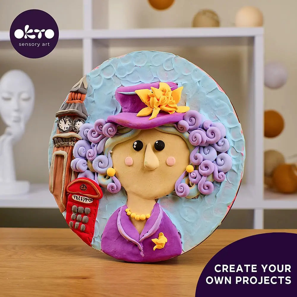 Choose the color you want to start with, pick up the clay with your fingers, and boldly apply it to the canvas. Create your background, then sculpt according to the template and transfer parts of the painting to the base. Feel how art is born under your hand.